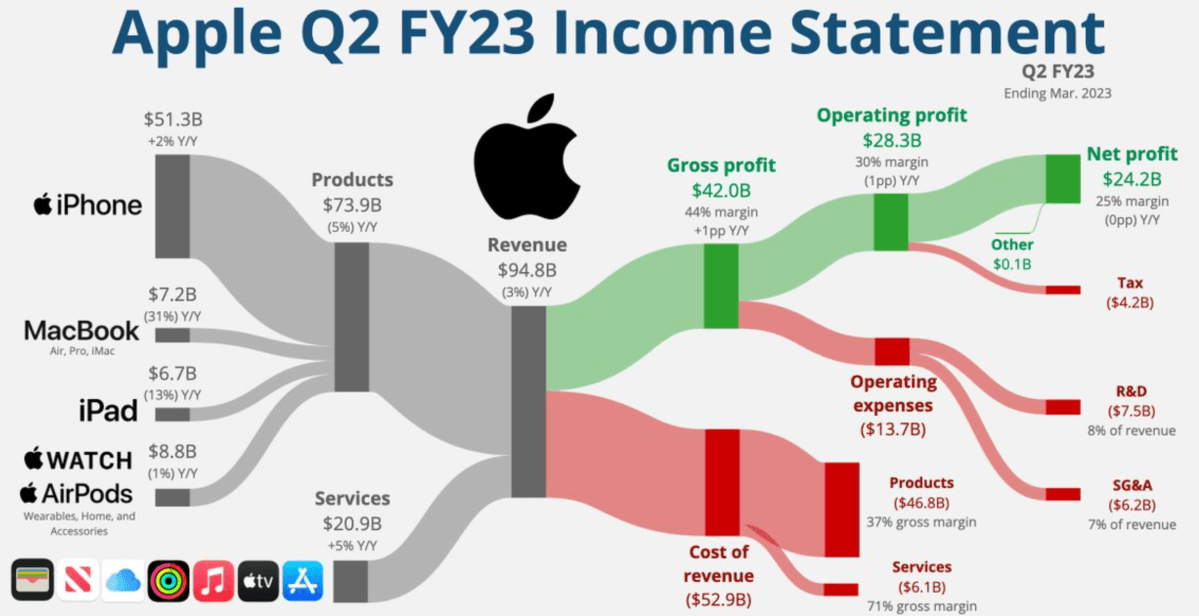 Queste infografiche possono limitarsi a semplici grafici, come l’andamento della spesa sanitaria nel tempo rappresentato da una linea, o essere vere e proprie opere complesse, in cui la visualizzazione aiuta a semplificare la comprensione del dato, come in questa rappresentazione dei flussi dei ricavi di Apple.