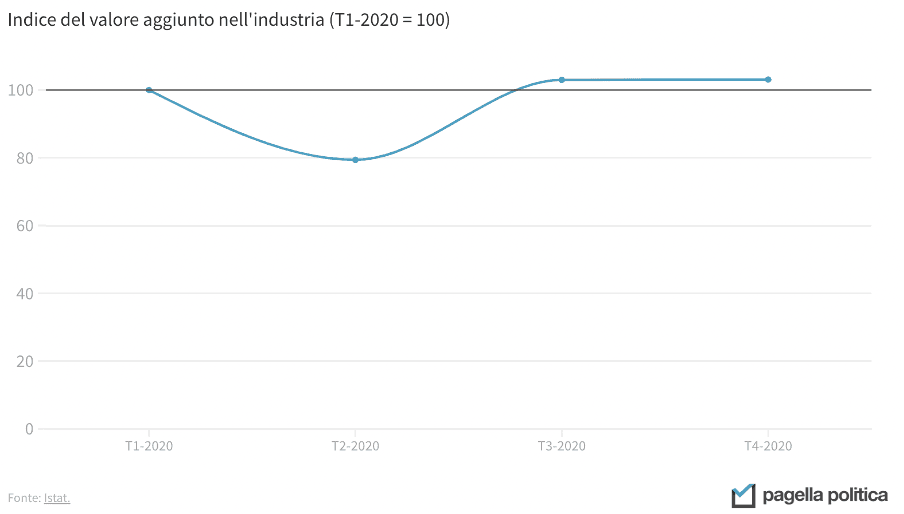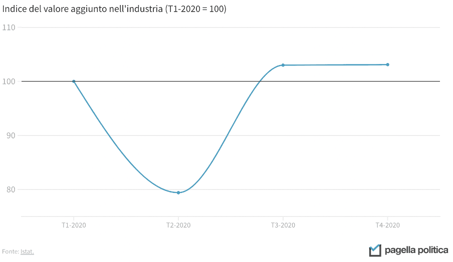 L’uso scorretto dell’asse verticale non riguarda solo i grafici a barre, ma anche le linee. I due grafici qui sotto, per esempio, mostrano lo stesso dato, ma il messaggio che arriva è diverso: nel primo caso, sembra che l’industria italiana si sia completamente fermata in corrispondenza del crollo, mentre nel secondo questa prospettiva risulta più contenuta. In entrambi i casi, considerando che il calo è stato del 20 per cento, la rappresentazione è forse un po’ estrema. Una buona via di mezzo potrebbe essere impostare a 50 il minimo della asse Y.